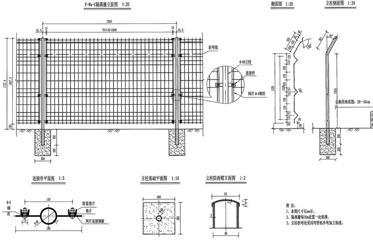 2、F-Ww-C焊接網(wǎng)隔離柵用Φ4mm低碳鋼絲制造,其性能需符合國家現(xiàn)行相關規(guī)范、規(guī)定;