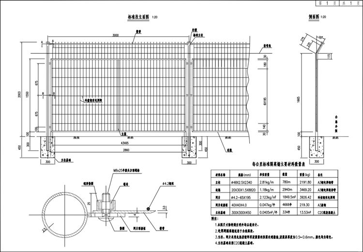 焊接網(wǎng)隔離柵采用直徑4mm鋼絲焊制,網(wǎng)片規(guī)格75×150mm。其力學(xué)性能應(yīng)符合 YB/T 5294-2009的規(guī)定。焊接網(wǎng)隔離柵立柱采用φ48 立柱。立柱與掛鉤點焊固定成整體后采用先鍍鋅后浸塑防腐處理,鋼絲網(wǎng)片鍍鋅防腐,鍍鋅量應(yīng)高于 120g/㎡,立柱設(shè) C20 混凝土基礎(chǔ)。 隔離柵立柱、斜撐等鍍鋅量應(yīng)高于450g/㎡。