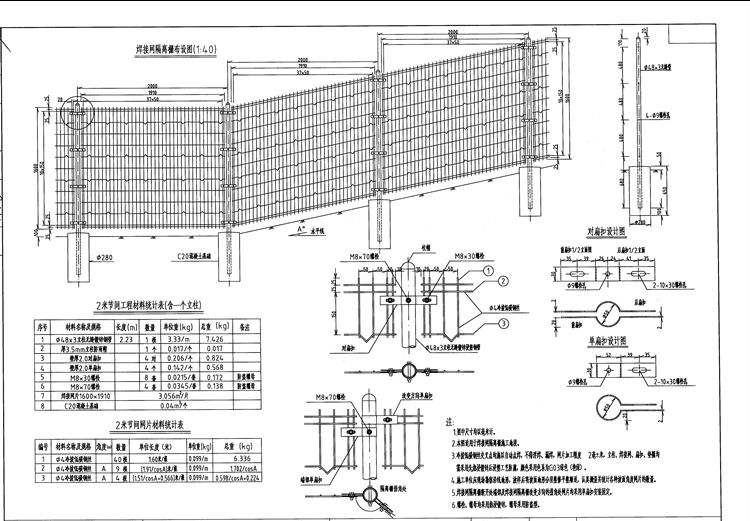 焊接網(wǎng)隔離柵網(wǎng)片采用φ4mm低碳鋼絲交叉自動焊接加工;普通焊接網(wǎng)隔離柵立柱采用φ48X3mm直縫鍍鋅鋼管加工,柱距2m;服務(wù)區(qū)聯(lián)絡(luò)道口處的焊接網(wǎng)隔離柵門結(jié)構(gòu)立柱采用φ60X3.5mm直縫鍍鋅鋼管加工,門體結(jié)構(gòu)由生產(chǎn)廠家根據(jù)實際需要設(shè)計加工。立柱、焊接網(wǎng)、墊片、活動門均需采用先熱浸鍍鋅+浸塑工藝雙層防腐,顏色系為G03綠色(艷綠)。連接件、螺栓、螺母采用熱浸鍍鋅,螺母需用防盜型。