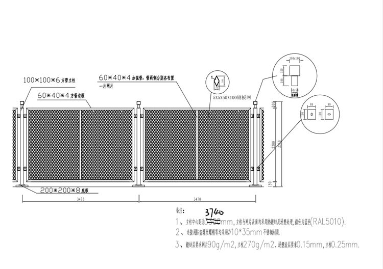 1、停車場(chǎng)圍欄立柱中心距為3740mm,立柱與網(wǎng)片均采用熱鍍鋅及浸塑處理,顏色為藍(lán)色(RAL5010)。