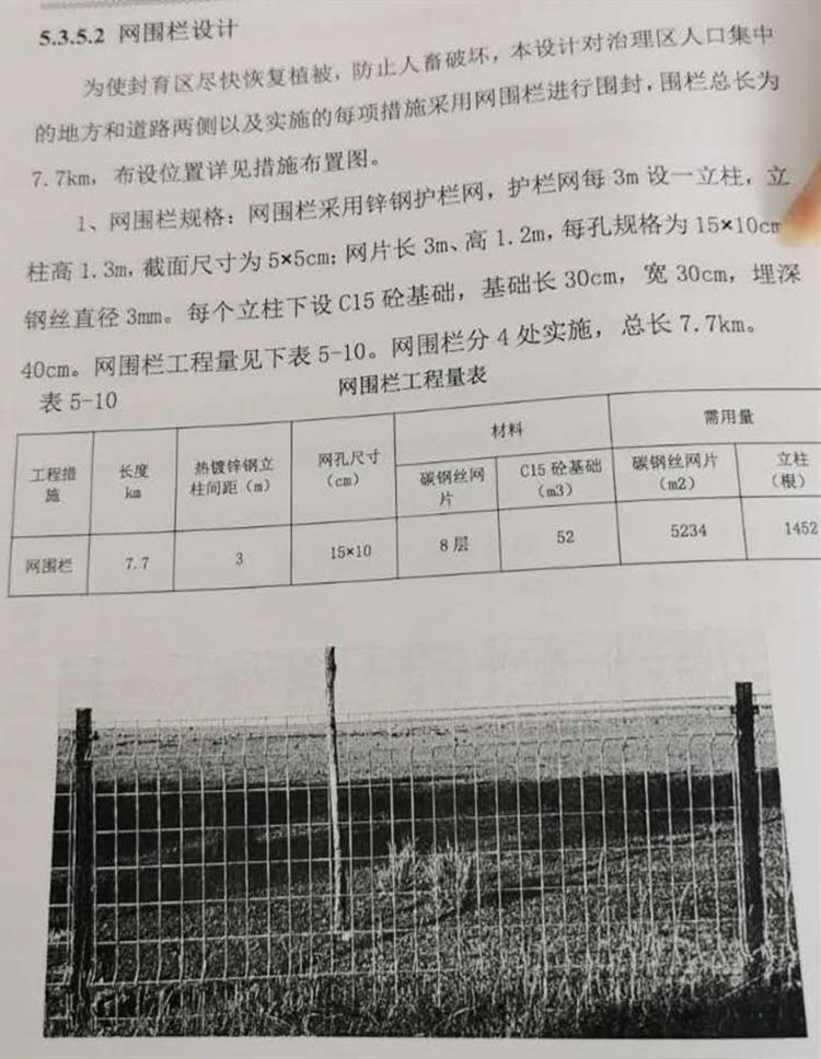 為使封育區(qū)盡快恢復(fù)植被,防止人畜破壞,本設(shè)計對治理區(qū)人口集中的地方和道路兩側(cè)以及實施的每項措施采用網(wǎng)圍欄進行圍封,圍欄總長為7.7公里,生態(tài)恢復(fù)網(wǎng)圍欄分四處安裝實施,布設(shè)位置詳見措施布置圖。