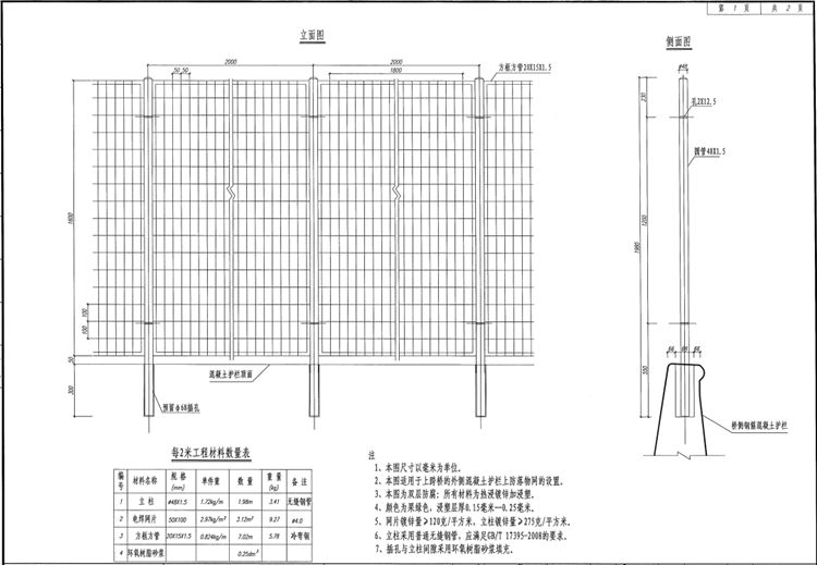 支線上跨橋外側(cè)混凝土護(hù)欄或梁柱式鋼護(hù)欄上均應(yīng)設(shè)置防落物網(wǎng),防落物網(wǎng)所有材料熱浸鍍鋅加浸塑,網(wǎng)片鍍鋅量120g/㎡,網(wǎng)片浸塑層厚度150μm,立柱鍍鋅量275g/㎡,立柱浸塑層厚度250μm。立柱采用普通無縫鋼管,混凝土護(hù)欄頂部預(yù)留立柱插孔,預(yù)留孔的垂直度偏差不超出1%,預(yù)留孔與立柱間隙采用環(huán)氧樹脂砂漿填充。同時,防落物網(wǎng)應(yīng)做好防雷接地處理,接地電阻應(yīng)小于10Ω。