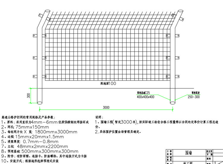 高速公路護欄網產品參數規(guī)格介紹1、網絲,直徑為4mm-6mm低碳鋼絲;2、網孔,75mm*150mm;3、網片高1800mm,網片寬3000mm;4、邊框,15mm*20mm*1.5mm;5、立柱,48mm*2mm*2200mm;6、浸塑厚度,0.7mm-0.8mm;7、預埋基礎,500mm*300mm*300mm;8、附件,防雨帽、連接卡、防盜螺栓;9、安裝方式,預埋式安裝。