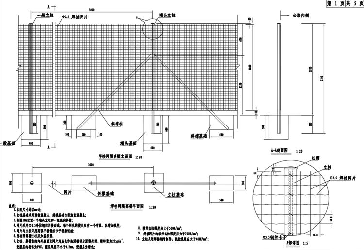焊接網(wǎng)隔離柵由立柱、網(wǎng)片、斜撐柱及緊固件等組成。焊接網(wǎng)隔離柵立柱采用燕尾柱,其中端頭立柱由60*2.0mm的焊接鋼管加工制成,一般立柱和拐角立柱由48*1.5mm焊接鋼管加工制成;隔離柵斜撐柱采用38*1.5mm焊接圓鋼管,焊接網(wǎng)由2.5mm低碳鋼絲焊接而成,網(wǎng)孔尺寸為101.6*50.8mm。每一卷焊接網(wǎng)的長(zhǎng)度為30m。焊接網(wǎng)的立柱間距為3.0m,每隔30m設(shè)置一個(gè)端頭立柱,并配合設(shè)置兩個(gè)斜撐柱,凡拐角處、封頭處均應(yīng)采用拐角立柱并設(shè)置橫向斜撐柱。焊接網(wǎng)隔離柵立柱、斜撐、網(wǎng)片均采用“熱浸鍍鋅浸塑復(fù)合涂層”的防腐處理方式,熱浸鍍鋅浸塑復(fù)合涂層由熱浸鍍鋅內(nèi)涂層和流化床浸塑外涂層組成。立柱、斜撐鍍鋅量不小于275g/㎡,網(wǎng)片鍍鋅量不小于90g/㎡。螺栓、螺母、墊圈等緊固件采用直接熱浸鍍鋅的防腐處理方式,鍍鋅量不小于350g/㎡,螺栓、螺母及帶螺紋的構(gòu)件熱浸鍍鋅后,應(yīng)清理螺紋或做離心分離處理。焊接網(wǎng)隔離柵熱浸鍍鋅所用的鋅應(yīng)為《鋅錠》(GB470-2008)中所規(guī)定的Zn99.995號(hào)鋅。浸塑材料采用聚乙烯(PE)高分子涂料,立柱、斜撐浸塑層厚度>0.25mm,網(wǎng)片浸塑層厚度>0.15mm,顏色為綠色,全線色號(hào)應(yīng)統(tǒng)一。防腐要求須滿足《公路交通工程鋼構(gòu)件防腐技術(shù)條件》(GB/T 18226-2015)的規(guī)定,涂層性能應(yīng)滿足《公路用防腐蝕粉末涂料及涂層》(JT/T600.1-2004~JT/T600.4-2004)的規(guī)定和要求。焊接網(wǎng)隔離柵立柱基礎(chǔ)采用 C20 預(yù)制素混凝土,斜撐基礎(chǔ)為 C20 現(xiàn)澆素混凝土。