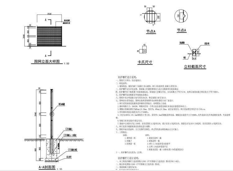 三、防護(hù)柵欄定位詳見總圖,基礎(chǔ)施工時(shí)遇特殊情況與設(shè)計(jì)及勘探單位聯(lián)系確定。