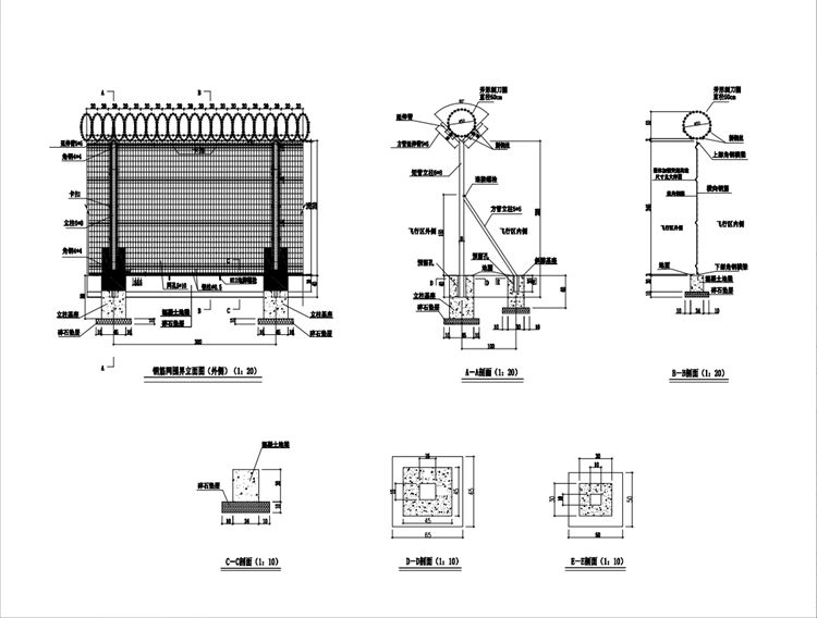 10、圖中立柱頂部應(yīng)加蓋柱帽,立柱與鋼筋網(wǎng)、立柱與斜撐及立柱與延伸臂的連接采用防盜形式并經(jīng)防腐處理。