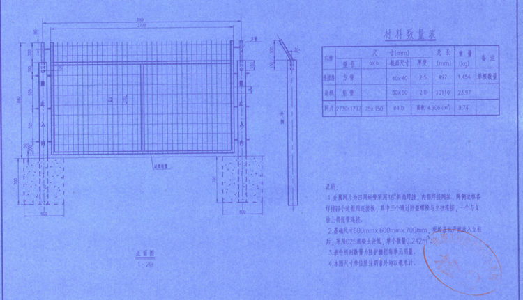 金屬網(wǎng)片采用Q235矩管邊框,規(guī)格30mm*50mm,矩管厚度2.0mm;內部網(wǎng)絲采用HPB300 ¢4.0mm高線冷拔鋼絲,規(guī)格75mm*150mm。