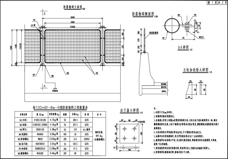 1) 一般立交橋防落網(wǎng)采用焊接網(wǎng)結(jié)構(gòu),焊接網(wǎng)采用低碳鋼絲,其力學(xué)性能應(yīng)符合《一般用途低碳鋼絲》GB343、《一般用途熱鍍鋅低碳鋼絲》YB243 的規(guī)定,柱距2m,代號Bf-Ww-B。