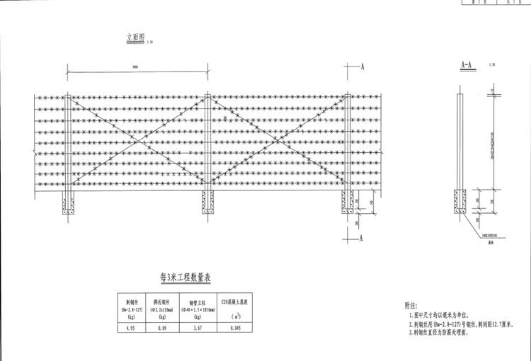 鍍鋅刺鋼絲隔離柵立柱采用φ48X1.5mm焊接鋼管,間距為3m,高出地面1.55m,剌鋼絲采用Bw-2.8-127號(hào),剌間距127mm。網(wǎng)眼寬度50X50mm,刺尖高25.4mm應(yīng)置于刺鋼絲中,網(wǎng)片由冷拉鋼絲點(diǎn)焊而成。表面先熱浸鍍鋅,后浸塑而成。隔離柵鋼構(gòu)件采用技術(shù)條件應(yīng)符合《碳素結(jié)構(gòu)鋼技術(shù)條件》(GB700-88)之規(guī)定,立柱均應(yīng)加蓋柱帽,里外熱浸鍍鋅,后表層噴塑而成。鋼構(gòu)件、刺鐵絲均應(yīng)做熱浸鍍鋅浸塑防腐處理,鍍鋅時(shí)應(yīng)符合《公路交通工程鋼構(gòu)件防腐技術(shù)條件》(GB/T 18226-2015) 之規(guī)定。顏色采用果綠色,色號(hào)可采用6012或6010。刺鋼絲隔離柵的立柱、基礎(chǔ)用于混凝土的水泥、沙石等材料,應(yīng)滿足現(xiàn)行交通行業(yè)標(biāo)準(zhǔn)《公路鋼筋混凝土及預(yù)應(yīng)力混凝土橋涵設(shè)計(jì)規(guī)范》(JTGD62-2012)中有關(guān)規(guī)定。如有未盡事宜,均按《公路交通安全設(shè)施設(shè)計(jì)細(xì)則》(JTG/T D81-2017)、 《高速公路交通工程及沿線設(shè)施設(shè)計(jì)通用規(guī)范》(JTG080-2006)、《公路交通安全設(shè)施設(shè)計(jì)規(guī)范》(JTGD81-2017)、《道路交通標(biāo)志和標(biāo)線》(GB5768-2009)、《 公路交通標(biāo)志反光膜》(GB/T18833-2012)、《公路交通標(biāo)志和標(biāo)線設(shè)置規(guī)范》(JTG D82-2009)以及《國家高速公路網(wǎng)命名和編號(hào)規(guī)則》(JTG A03-2007)和《國家公路網(wǎng)交通標(biāo)志調(diào)整工作技術(shù)指南》的有關(guān)規(guī)定執(zhí)行。
