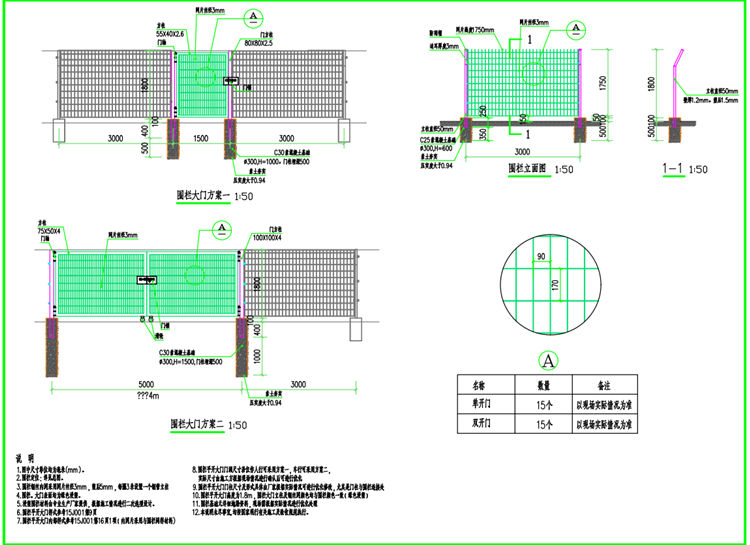 6、圍欄皮隔開(kāi)大門(mén)門(mén)洞尺寸若僅作人行可采用方案一,車(chē)行可采用方案二,實(shí)際尺寸由施工方根據(jù)現(xiàn)場(chǎng)情況進(jìn)行確認(rèn)后可進(jìn)行優(yōu)化。