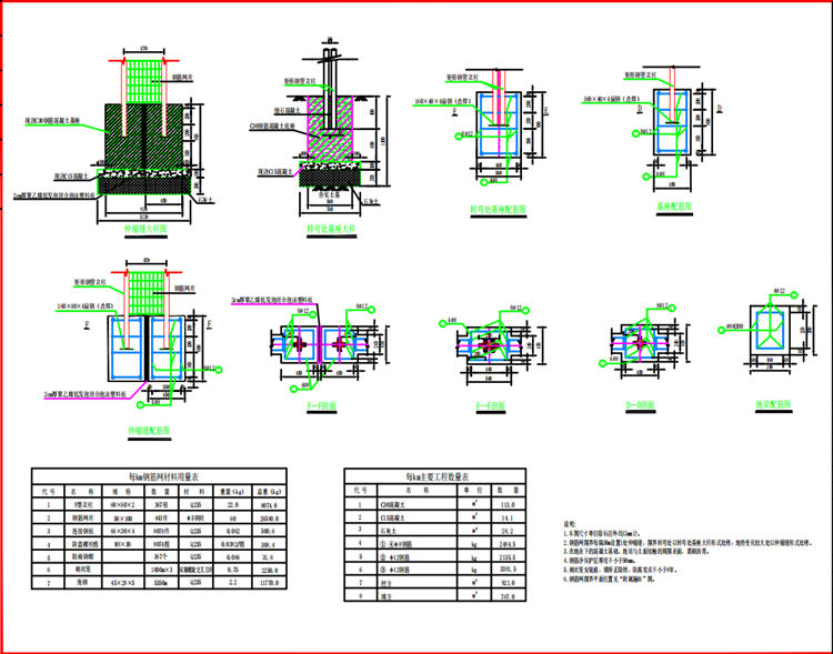 鋼筋網刺鐵絲圍界主要由刺絲滾網、立柱、網片、地梁、邊框、現(xiàn)澆鋼筋混凝土基礎構成。立柱(矩形鋼管,60mmX60mmX2mm)與網片構成鋼筋網刺鐵絲圍界的主體,鋼筋網片四周用45mmX28mmX5mm角鋼加固。外側鋼筋網刺鐵絲圍界每根立柱的總高度(不含埋深長度)為3.46m,頂部設品字形刺絲滾網防攀爬(直徑500mm),地面以上總高度為3.78m;內側鋼筋網刺鐵絲圍界每根立柱的總高度(不含埋深長度)為2.53m,頂部設一道刺絲滾網防攀爬(直徑500mm),地面以上總高度為2. 85m。在兩道鋼筋網刺鐵絲圍界鋼筋網片底部均加1lm 高密集網片,由Φ3浸塑鋼絲制作,網片尺寸12.5X 100mm,與鋼筋網片采用電焊連接,以防止小動物鉆爬。兩道鋼筋網刺鐵絲圍界的立柱間距均為3.0m,地梁橫斷面尺寸為24cmX30cm,采用現(xiàn)澆C30鋼筋混凝土地梁?;A自上而下依次為45cmX45cmX80cm現(xiàn)澆C30鋼筋混凝土基座、10cm厚C15混凝土、20cm厚石灰土,石灰土中石灰含量不低于12% (質量比),壓實度不小于95% (重型擊實),土基壓實度不小于93% (重型擊實)。在鋼筋網刺鐵絲圍界外側每150m設置一處醒目的禁止翻越警告標識牌,標識牌內容應清晰可見。