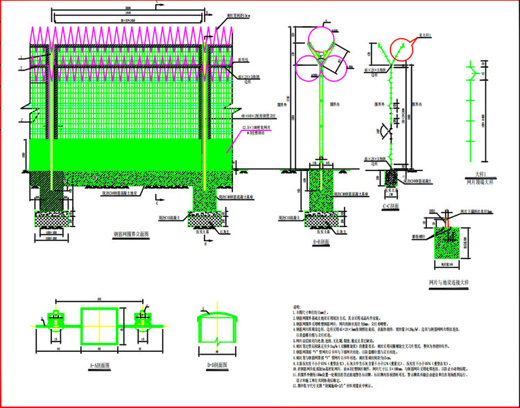 2.鋼筋網(wǎng)刺鐵絲圍界基礎(chǔ)及地梁采用現(xiàn)澆方式,其余采用成品構(gòu)件安裝。
