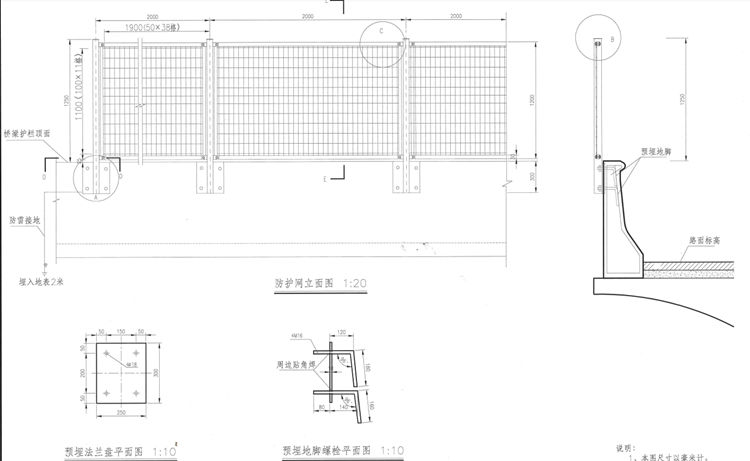 4、施工中,必須確保預埋地腳與護攔主筋的連接。設計中,預埋地腳故意超長并且設彎鉤,主要目的在于方便施工中預埋地腳與護欄主筋的連接。
