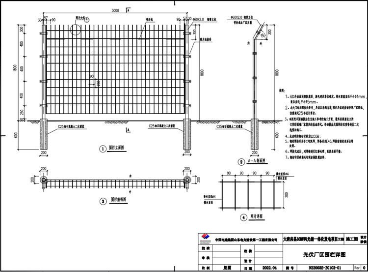 3、本圖所示圍墻做法僅為施工參考的施工方案,應(yīng)根據(jù)業(yè)主所訂貨的圍墻廠家提供的基礎(chǔ)形式、詳細(xì)做法及圍網(wǎng)的花型等進(jìn)行二次選型和施工。