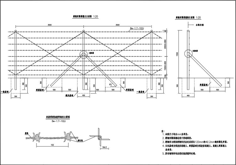 6、刺鋼絲隔離柵的立柱間距為3.0m,兩個雙向斜撐間距為30m。兩個三向斜撐間距為90m,凡拐角處均應(yīng)設(shè)置單向斜撐;