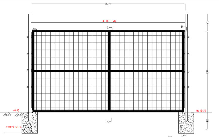 結(jié)合當(dāng)?shù)貙?shí)際情況,依據(jù)《高標(biāo)準(zhǔn)農(nóng)田建設(shè)通則》(GB/T30600-2014),本次項(xiàng)目布設(shè)防護(hù)網(wǎng),防護(hù)網(wǎng)網(wǎng)片規(guī)格為3m*1.8m成品冷拔低碳鋼絲焊接網(wǎng)片(孔徑50mm*100mm,絲徑5.0mm),立柱高2.2m(為48mm*2.5mm*2200mm鋼管),立柱頂端蓋有塑料蓋或防雨帽,在立柱上面設(shè)計(jì)一道刺繩,立柱基座為0.3m*0.3m*0.5m,埋入地面0.4m,采用C30現(xiàn)澆混凝土,在網(wǎng)片四周增加邊框,在網(wǎng)片中間增加十字加固邊框,通過在立柱上和網(wǎng)片上焊接連接件,用螺絲將連接件固定在一起。為方便村民通行方便,設(shè)計(jì)防護(hù)鐵門,規(guī)格為3m*1.8m,鐵門與立柱之間通過焊接連接件用螺絲將其固定。