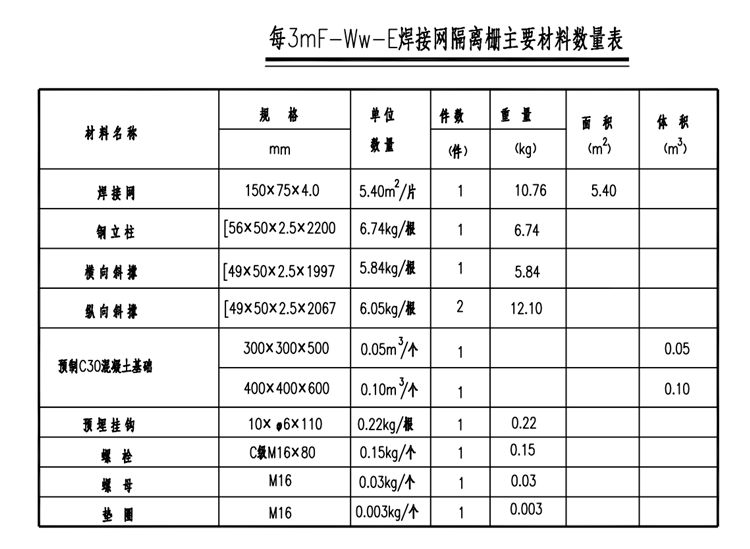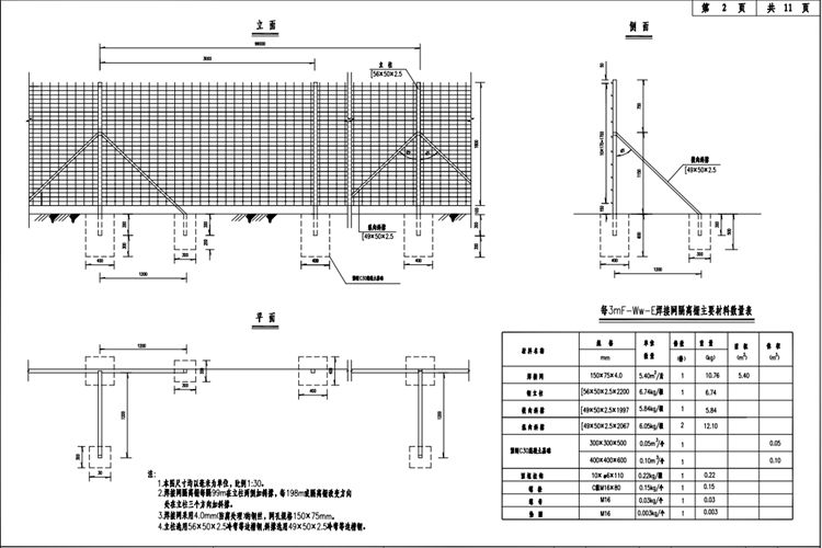 本圖尺寸均以毫米為單位,比例1:30。焊接網(wǎng)隔離柵每隔99m在立柱兩側加斜撐,每198m或隔離柵改變方向處在立柱三個方向加斜撐。焊接網(wǎng)采用4.0mm(防腐處理)的鋼絲,網(wǎng)孔規(guī)格150X75mm。立柱選用56X50X2.5冷彎等邊槽鋼,斜撐選用49X50X2.5冷彎等邊槽鋼。隔離柵設置于公路用地界內(nèi)側0.3m 處,地形有起伏時,片網(wǎng)隔離柵按階梯形設置;片網(wǎng)隔離柵遇到≤3m 的溝渠或涵洞時,可直接跨過,但在跨躍處需設置異形網(wǎng)片,防止人或動物由此進入。每段隔離柵的起終點或隔離柵需要斷開的地方,應針對不同的情況做端頭圍封,在隔離柵需改變方向的地方,應做拐角處理。焊接片網(wǎng)隔離柵采用熱浸鍍鋅涂塑處理,螺栓、螺母、墊圈等連接件的鍍鋅量為120g/㎡,立柱等構件為275g/㎡,網(wǎng)片塑層厚度不小于0.3mm。立柱等鋼構件塑層厚度不小于76μm,焊接網(wǎng)隔離柵的鋼構件均應作熱浸鍍鋅后鍍塑處理。鍍鋅時應符合下表的規(guī)定,熱浸鍍鋅所用的鋅應為符合《公路交通工程鋼構件防腐技術條件》中引用的 GB/T470中所規(guī)定的特1號或1號鋅錠,鍍鋅后再浸塑或噴塑,顏色為果綠色。所有鋼構件均應進行熱浸鍍鋅涂塑處理,螺栓、螺母、墊圈等連接件的鍍鋅量為120g/㎡,其它構件為275g/㎡,網(wǎng)片塑層厚度不小于0.3mm。其它鋼構件涂塑層厚度不小于76μm。