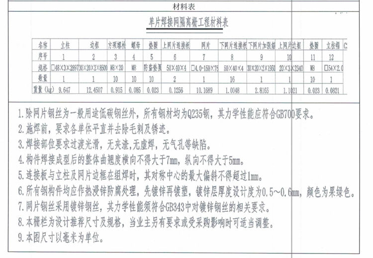 1.除網(wǎng)片鋼絲為一般用途低碳鋼絲外,所有鋼材均為Q235鋼,其力學(xué)性能應(yīng)符合GB700要求。