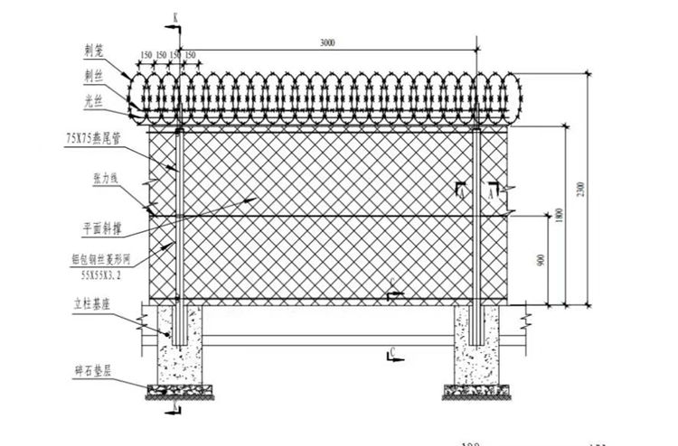5、鋁包鋼絲菱形網(wǎng)圍網(wǎng)上部安裝防攀爬滾刀刺籠,刀刺圈間距150mm,刀刺網(wǎng)材質(zhì)為鍍鋅材質(zhì)。