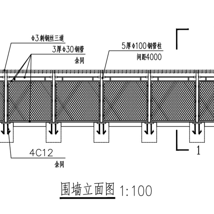 1、金屬圍墻立柱采用Φ100*5.0mm鍍鋅鋼管制作而成,立柱間距4000mm,立柱焊接法蘭盤(pán),打膨脹螺絲固定立柱。