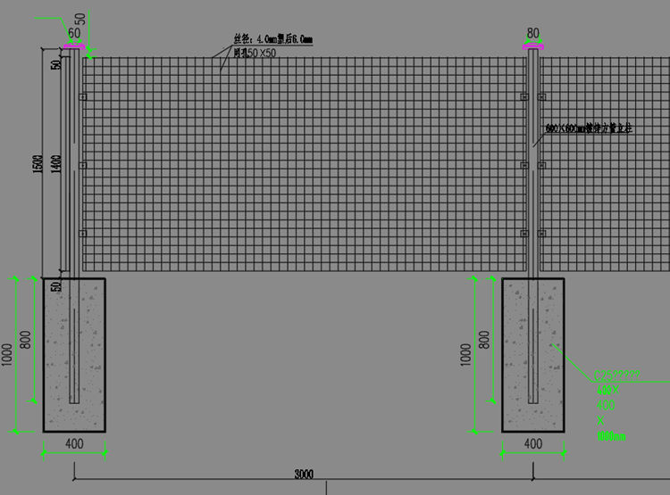 4.鋼絲網(wǎng)圍界立柱基礎(chǔ)混凝土尺寸為400x400x1000,局部遇淺坑處應(yīng)對(duì)地面進(jìn)行平整。