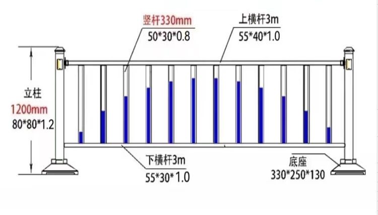 3.鋅鋼護欄橫桿接口,圓弧形設計管件,使管件與接口銜接流暢穩(wěn)固、便于安裝,方管材質(zhì)為鋅鋼(即鍍鋅鋼管),立柱80*80-1.2,橫桿55*40-1.0,豎桿50*30-0.8,底座為鑄鐵,鑄鐵重量不低于20公斤,底座設有地面安裝固定孔口。
