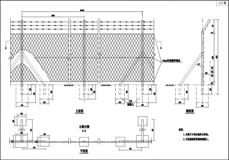 2.編織網(wǎng)隔離柵沿公路用地界布置,立柱在用地界內(nèi)側(cè)25cm處。