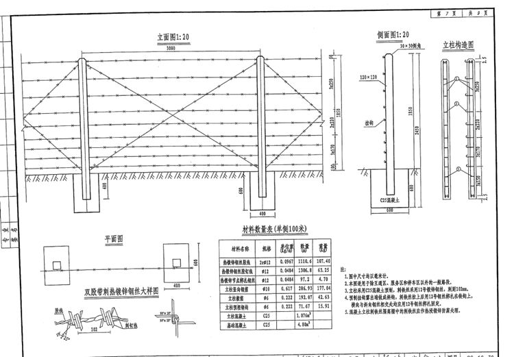 廣西玉林養(yǎng)殖場刺鋼絲圍欄專業(yè)生產廠家1.圖中刺鋼絲圍欄尺寸均以毫米計。2.本圖刺鋼絲圍欄適用于除互通區(qū)、服務區(qū)和停車區(qū)以外的一般路段。3.刺鋼絲圍欄立柱采用C25混凝土預制,刺鋼絲采用12號鍍鋅鋼絲,刺距102mm。4.刺鋼絲圍欄預制掛鉤露出端做成斜鉤,刺鋼絲拉上后用12號鋼絲綁扎在鐵鉤上,橫向與斜向鋼絲相交處均應用12號鋼絲綁扎固定。5.混凝土立柱刺鋼絲圍欄中的刺鋼絲應作熱浸鍍鋅防腐處理。