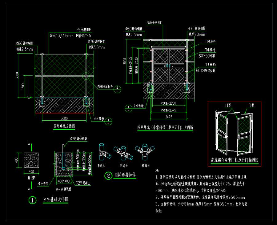 9、圍網(wǎng)安裝形式為直插式預(yù)埋,圖示為預(yù)埋方式適用于未施工的素土地面,如地面已做混凝土硬化處理,且混凝土強(qiáng)度大于C25、厚度大于200mm,則改用水鉆取預(yù)埋孔,立柱預(yù)埋孔?150。