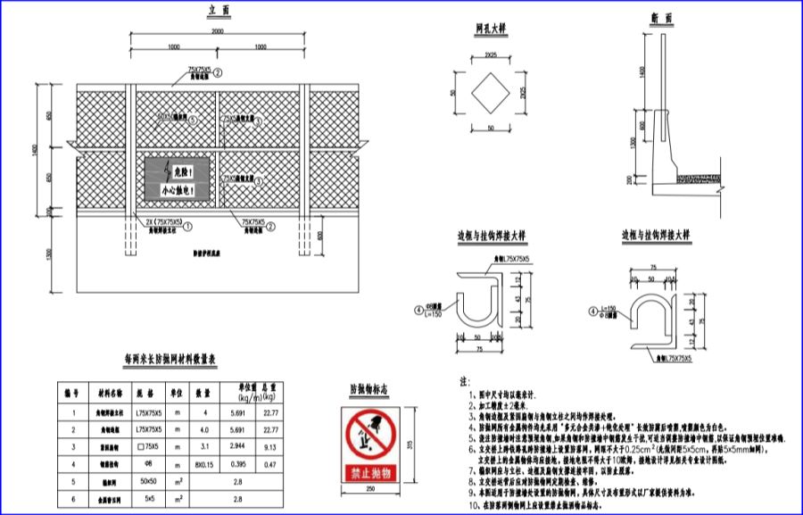 9、本圖適用于防撞墻處設(shè)置的防拋物網(wǎng),具體尺寸及布置形式以廠家提供資料為準(zhǔn)。