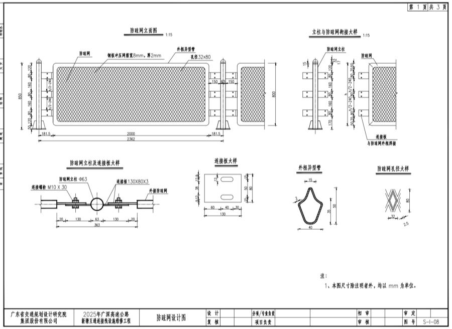 3、防眩網(wǎng)網(wǎng)與外框鋼管焊接成整體結(jié)構(gòu)。板材采用Q235低碳鋼,沖壓成型。螺檢均采用8.8級大六角頭高強(qiáng)螺栓采用防盜螺栓,M10X30螺栓采用全螺紋,頭部高度為6.4mm。