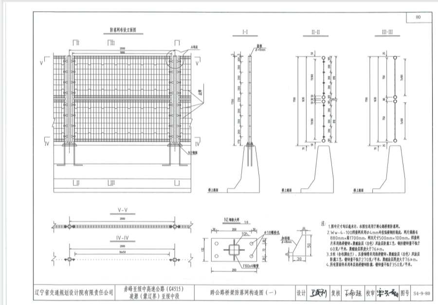 1.圖中尺寸均以毫米計,本圖適用于跨公路橋梁防落網(wǎng)。