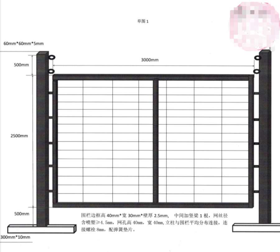 2.活動圍欄具體規(guī)格3000mmX2500mm(寬1500mm 處加裝豎梁一根),圍欄孔徑40mmX40mm,鋼絲噴塑后不小于4.5mm,圍欄四周方鋼邊框尺寸為 30mmX40mmX2.5mm(40mm 為邊框正面高度)。(見草圖 1)