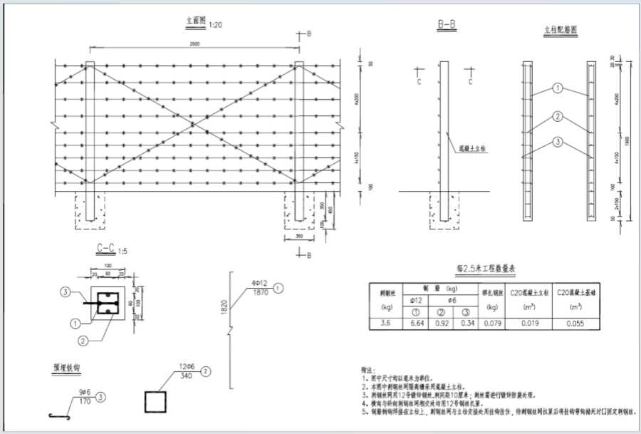 2.本圖中刺鋼絲網(wǎng)隔離柵將采用混凝土立柱。