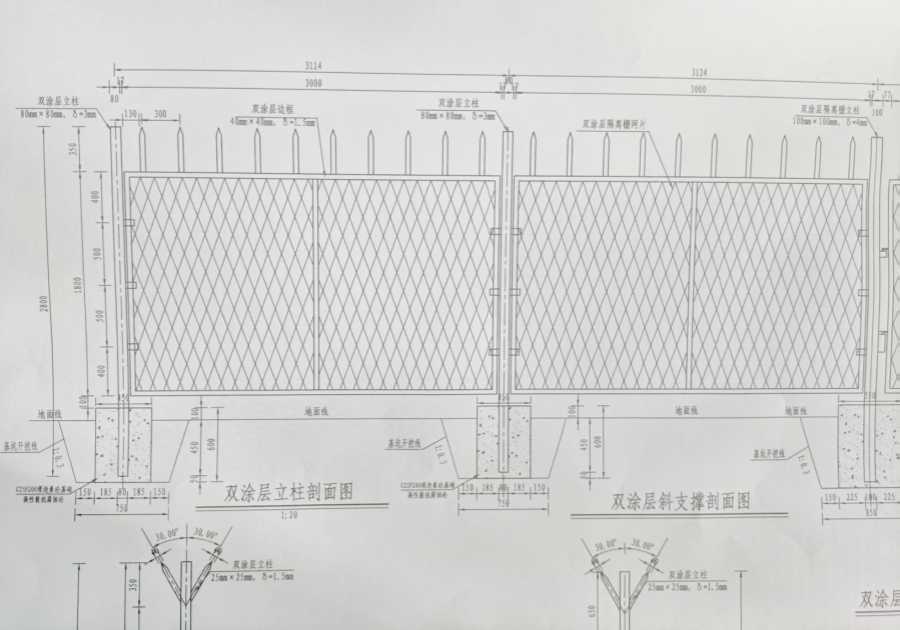 2、雙涂層隔離柵Gw-3.0-55: (網片采用鋼片網,網片規(guī)格3mx1.8m,厚度3.0m,網孔尺寸55mmx150mm(菱形對角尺寸),邊框及豎桿方管40mmx40mmx1.5mm,配件包括:防雨帽、連接卡及防盜螺栓等):方管立柱采用80mmx80mm,壁厚3.0m,單根立柱長2.8m,間距3m,立柱與網片的連接方式為焊接。立柱基礎C25F200(高性能抗腐蝕砼)現澆混凝土基礎,規(guī)格尺寸:0.45x0.45x0.6m(長x寬x高)。