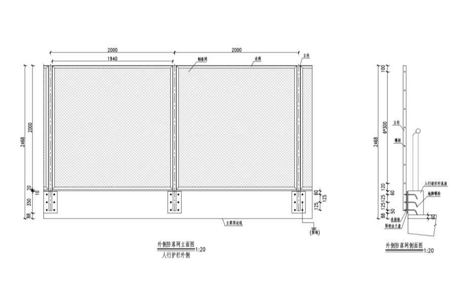 2、當防落網布置于人行道人行護欄外側時,每隔2m預埋地腳螺和法蘭盤,當防落網布置于車行道防
