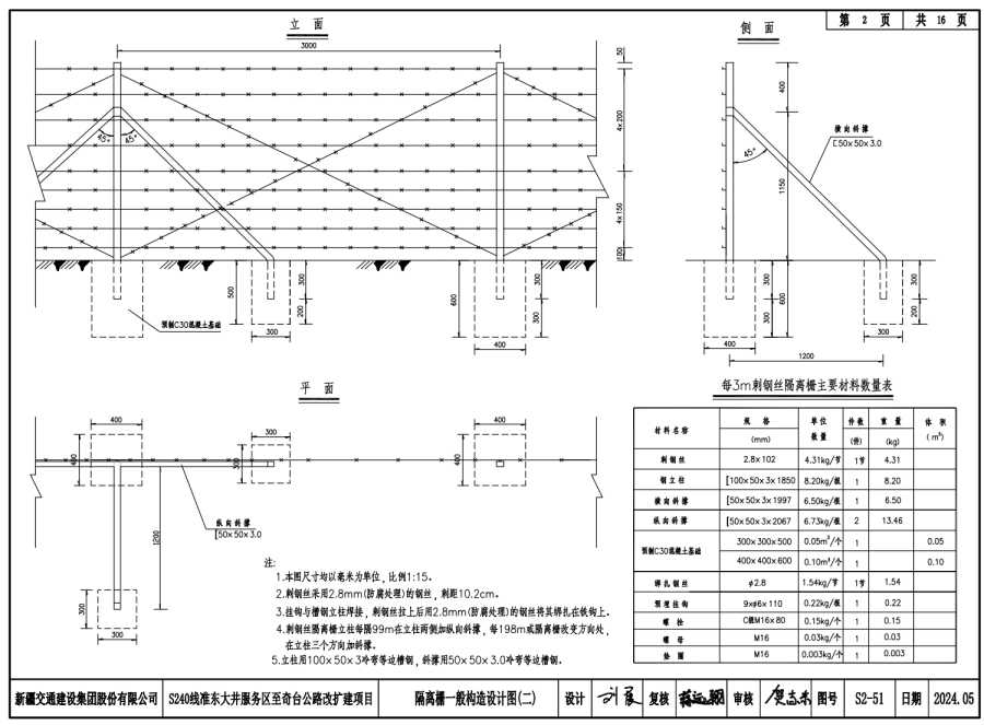 4.刺鋼絲隔離柵立柱每隔99m在立柱兩側加縱向斜撐,每198m或隔離柵改變方向處,在立柱三個方向加斜撐。