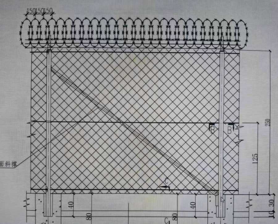 8、圖中圍界總高度為3.0m,立柱間距為30m,為確保圍界安置后的穩(wěn)固,要求每2個(gè)立柱設(shè)一道斜撐,轉(zhuǎn)折處每個(gè)立柱設(shè)一道斜撐。